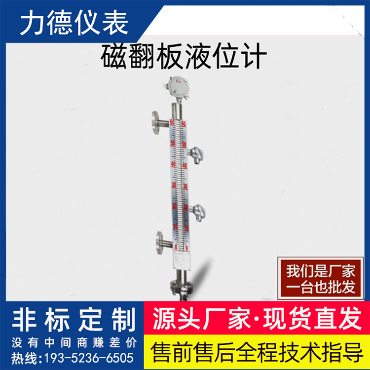 采用连通器的原理,使容器内液体等高度引入到液位计主体管内。在主体管内的浮球组件,根据浮力原理和磁耦合原理。当被测容器中的液位升降时,液位计主导管中的浮子也随之升降,浮子内的磁钢通过磁耦合传递到现场指示器,驱动红、白翻柱翻转180。,当液位上升时,翻柱由白色转为红色,当液位下降时,翻柱由红色转为白色,指示器的红、白界位处为容器内介质液位的实际高度,从而实现液位的指示。